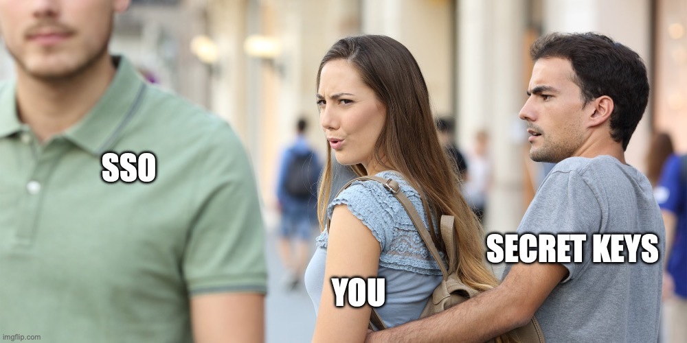 - Ditching these keys altogether and start using SSO instead. Just when you thought you were done we will redo it with SSO instead.