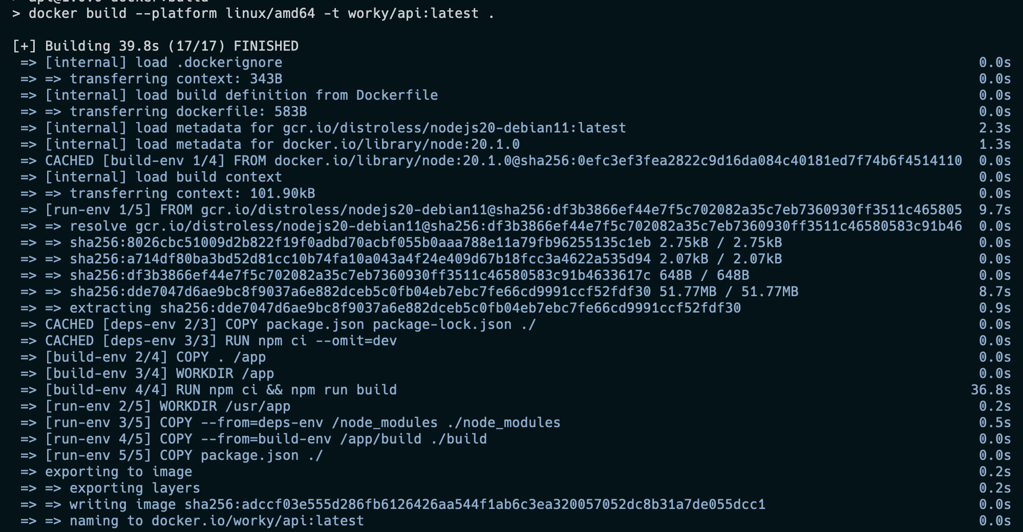 6COPY package.json ./Now, the final act! We're in the distroless Node.js image, building our grand production at /usr/app. We move in our essential props – node_modules from our deps-env stage and the compiled code from the build-env stage. We even slide in our package.json script for good measure.